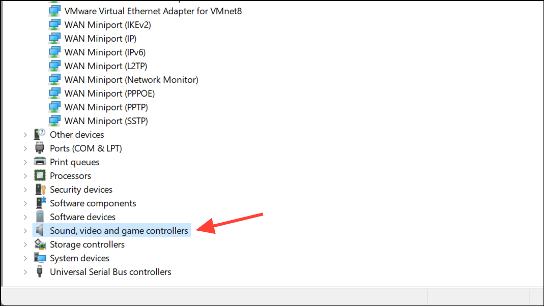 Step 2: In the Device Manager window, locate and expand the category 'Sound, video and game controllers' to see your audio devices.