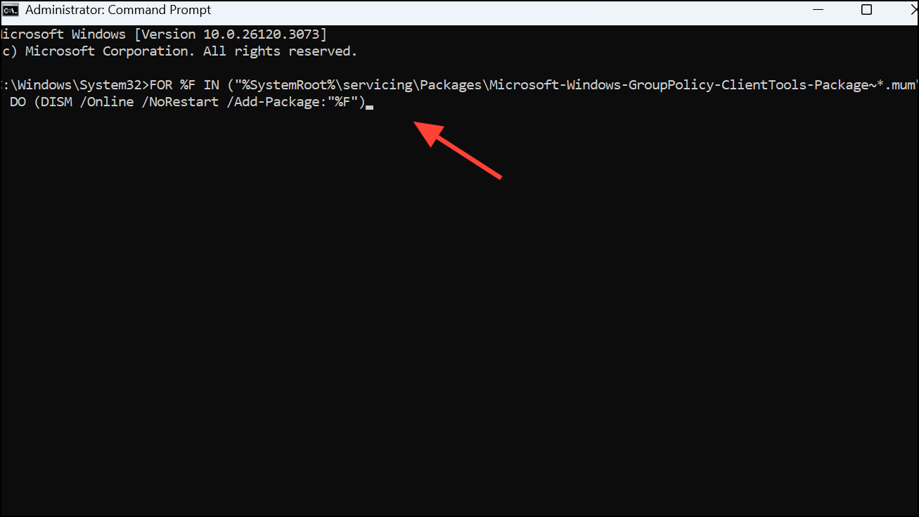 Step 2: Enter the following commands one at a time, pressing Enter after each. These commands instruct Windows to install Group Policy Editor components from internal system packages using the Deployment Image Servicing and Management (DISM) tool: