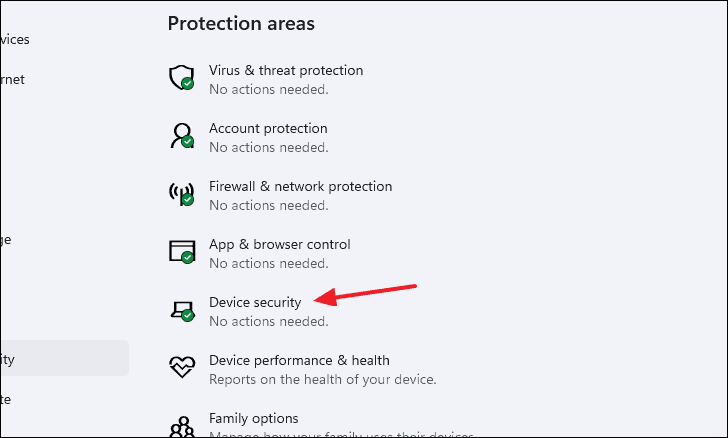 Step 4: In the Windows Security window, select Device security under "Protection areas."
