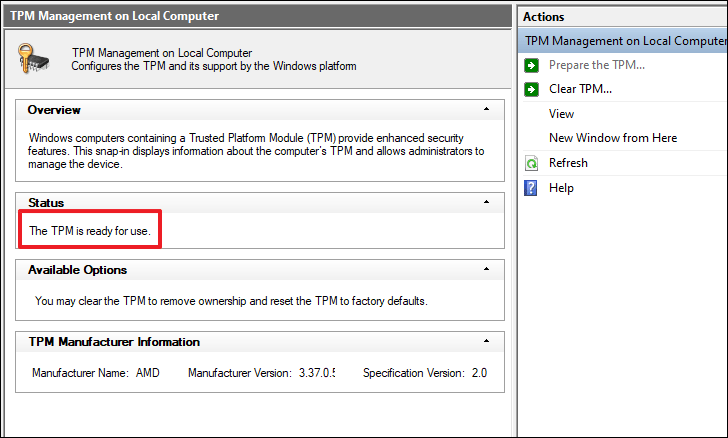 This will open the TPM Management console. If the Status section displays "The TPM is ready for use," then TPM 2.0 is active on your PC.