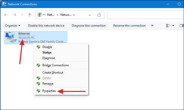 - In the Network Connections window, right-click on your network adapter and select Properties.