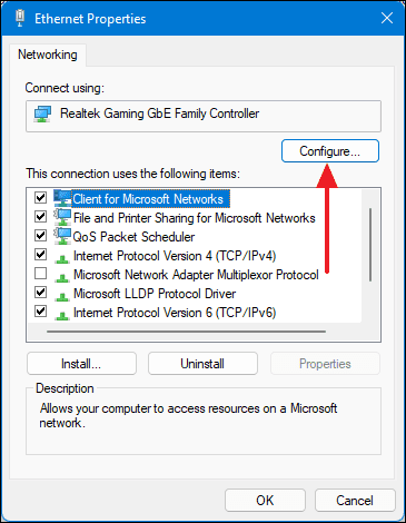 - In the Ethernet Properties dialog, click on Configure...
