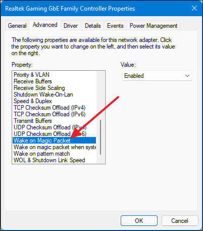 - In the Property list, find and select Wake on Magic Packet, then set its value to Enabled.