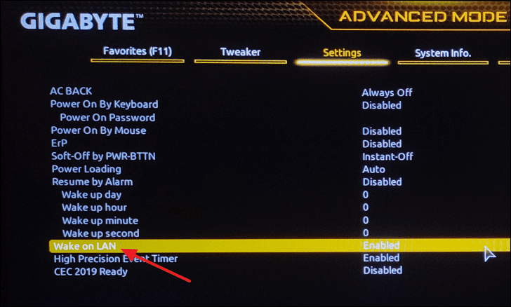 - Find the Wake on LAN option and set it to Enabled.