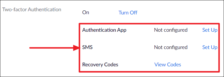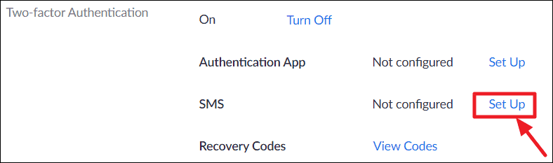 Once Two-Factor Authentication is enabled on your Zoom account, you’ll see options to set up 2FA with either an ‘Authentication App’ like Google Authenticator or SMS or both the methods.