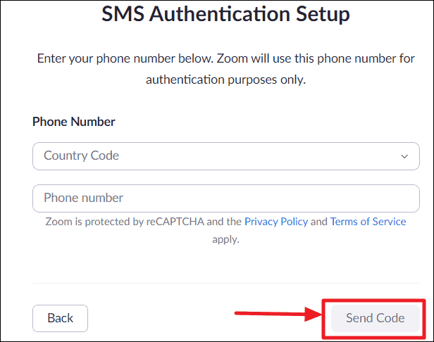 The ‘SMS Authentication Setup’ page will open. Here, configure the phone number on which you’d like to receive authentication codes via SMS by first selecting your country code and then entering your Phone number in the respective fields.