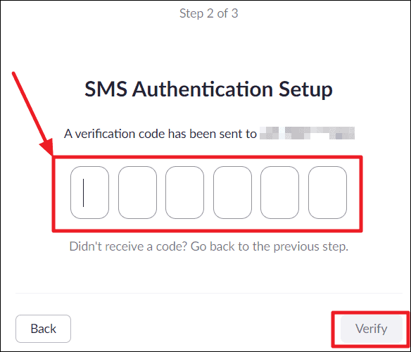 Check text messages inbox on your phone and look for a six-digit verification code sent by Zoom. Enter the code in the dialogue box shown on the screen and hit the ‘Verify’ button.