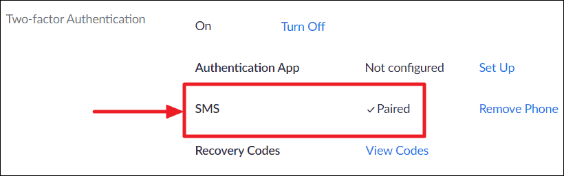 After successful verification, you will be redirected to the Profile settings page of your Zoom account, and you’ll see a ‘Paired’ status for the SMS authentication method under the ‘Two-Factor Authentication’ settings.