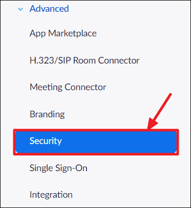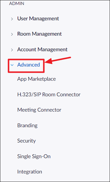 After logging in, click the ‘Advanced’ option in the navigation panel on the left to expand and view all advanced settings available for your Zoom account.