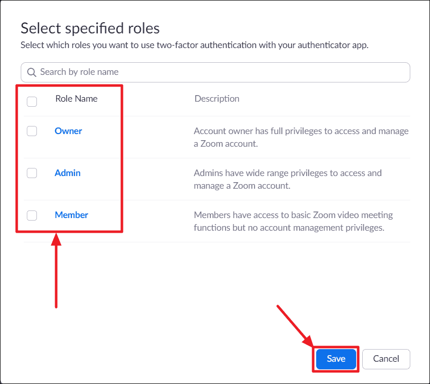 Users with specific roles: This setting enables 2FA for only the users with some specified roles. Click on the pencil icon beside “Selected user roles”, choose the roles, then click Save.