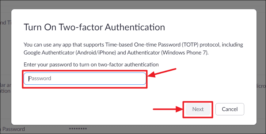 You will be asked to enter your Zoom password to turn on two-factor authentication, enter your password and click the next button.
