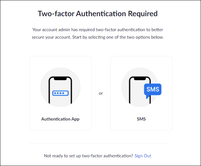 The next time your organizations’ users will login to their Zoom account, they will see a “Two-Factor Authentication Required” screen with options to set up an authentication method of their choice (that’s if you enabled both “Authentication app” and “Text message (SMS)” authentication methods.
