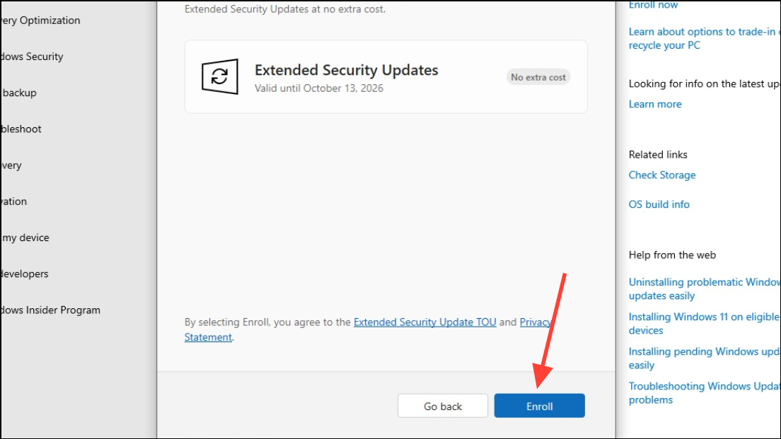 Step 6: After enrollment, your PC will receive monthly security updates through Windows Update until October 13, 2026. You can verify your enrollment status in the same Windows Update section.