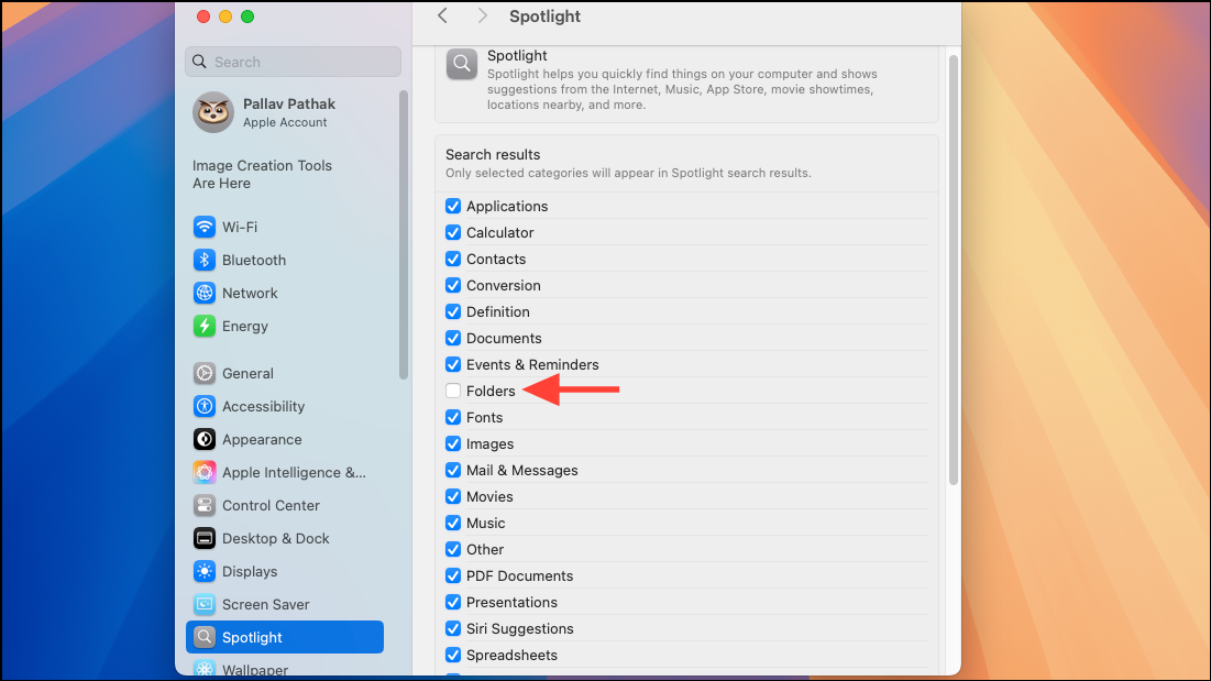 Step 2: Click on Spotlight from the list of available preferences. Now, you will see a list of categories that will appear in the Spotlight search. Simply click and deselect the items you don't want to see in the search, such as Folders.