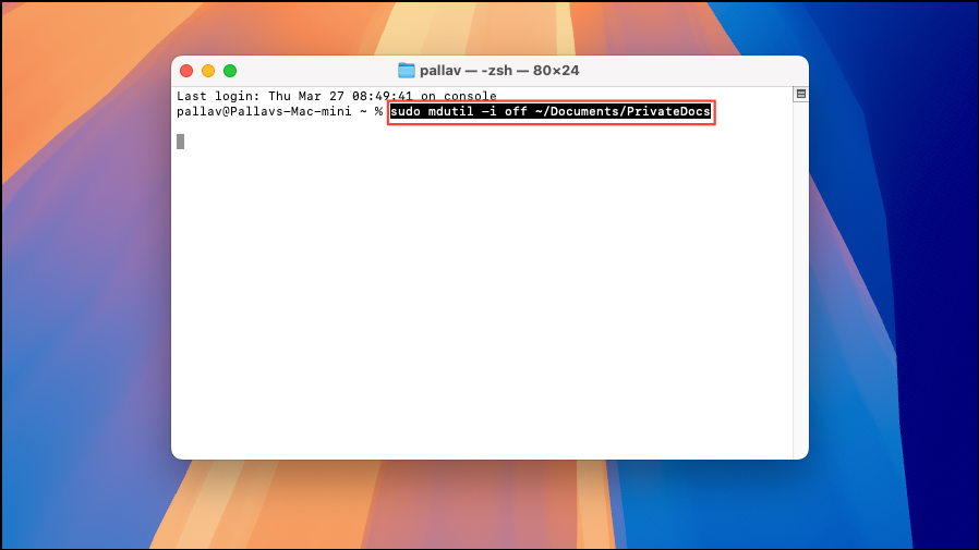 sudo mdutil -i off /path/to/folder_or_diskReplace /path/to/folder_or_disk with the actual path to the item you want to exclude. For example, to exclude a folder named "PrivateDocs" located in your Documents folder, the command would look like this: