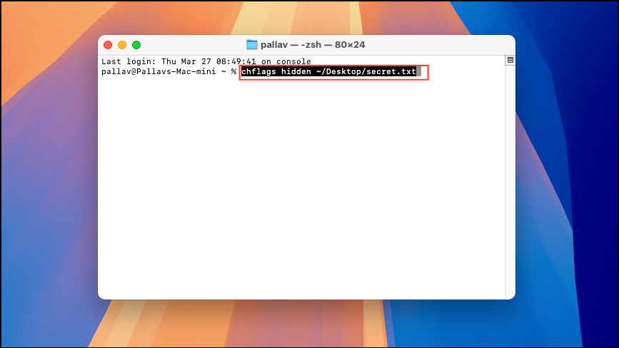 chflags hidden /path/to/fileReplace /path/to/file with the actual path to your file. For example: