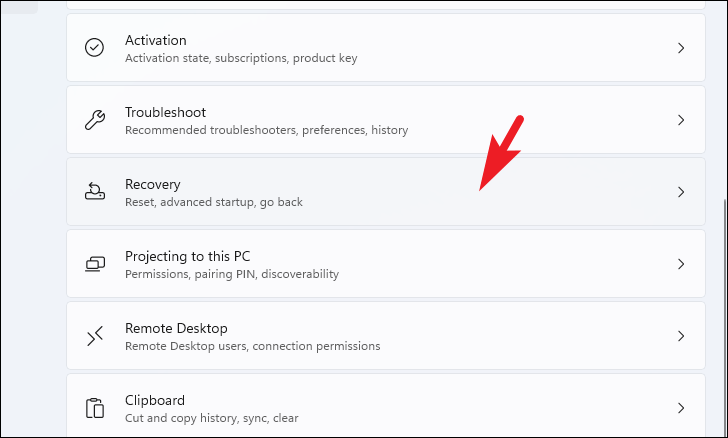 Step 3: Scroll down on the right pane and click on Recovery.