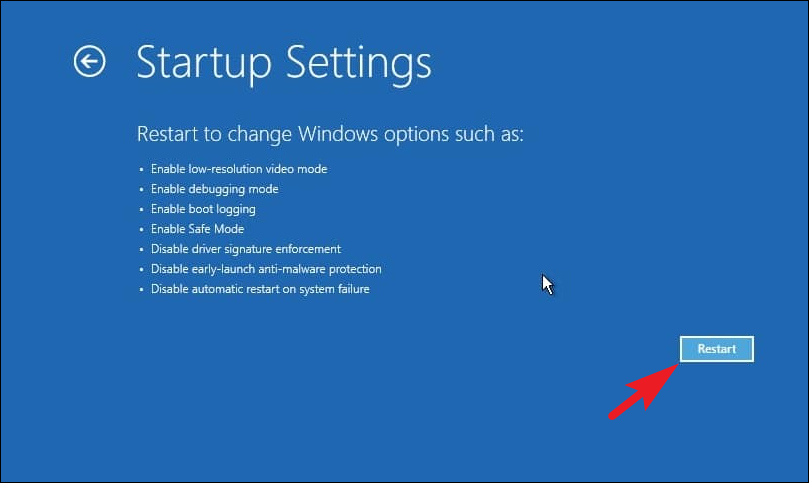 Step 8: Click on Restart to proceed to the Startup Settings menu.