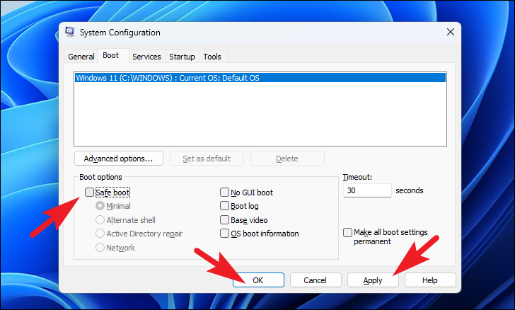 Step 3: Navigate to the Boot tab. Under the Boot options section, uncheck the box next to Safe boot to disable it. Click on Apply to save your changes, then click OK to close the window. A prompt will appear on your screen.