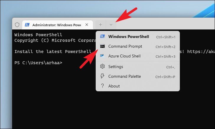 Step 3: In the Terminal window, click the downward arrow icon at the top and select Command Prompt from the dropdown menu. Alternatively, you can press Ctrl + Shift + 2 to open Command Prompt.