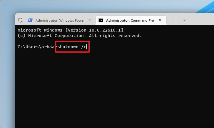 Step 5: After the command executes successfully, type the following command and press Enter to restart your computer: