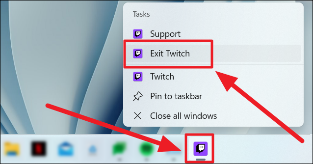 You can exit Twitch without having to change the app-closing settings. Simply double-finger tap on the ‘Twitch’ icon on your taskbar. Select ‘Exit Twitch’ from the menu.