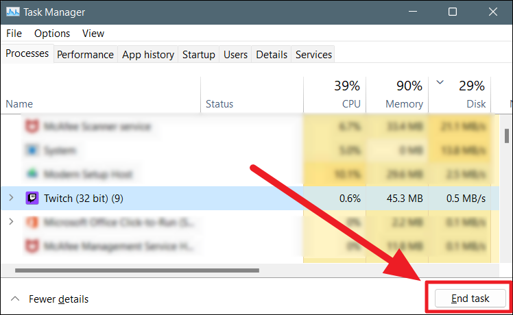 Locate ‘Twitch’ in the list of ‘Processes’. Click to highlight the app and then click the ‘End Task’ button at the bottom right corner of the screen.