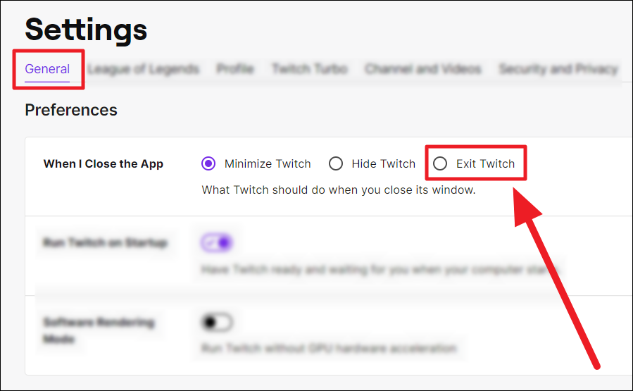 You will land on the ‘General’ tab. Stay on this tab and navigate the ‘When I Close the App’ section. There are three options here – Minimize Twitch, Hide Twitch, and Exit Twitch. The former is selected by default. To exit Twitch when you close the app, click the radio button in front of the ‘Exit Twitch’ option to select it.