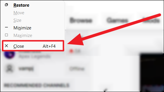 Another trick is to hold Alt + Spacebar while on the Twitch app window or double-finger tap the app’s title bar. Then, select ‘Close’ from the menu that pops to the top left corner of the screen or anywhere along the title bar.