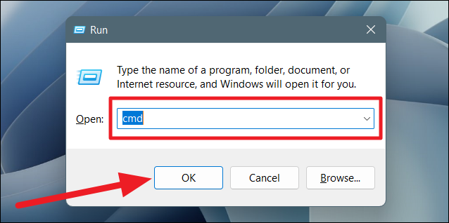 If you can’t end Twitch by simple means, you can force stop it with Command Prompt. Launch ‘Run’ by holding Windows + R on your keyboard. Now, type cmd in the ‘Open’ text field and hit Enter or click OK.