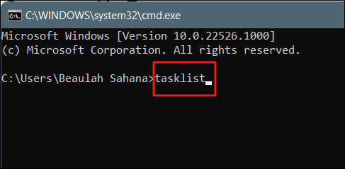 Enter ‘tasklist’ in the command prompt window and press Enter on your keyboard to generate the list of all the tasks running on your computer. This will help enter the right keyword in the terminating command.