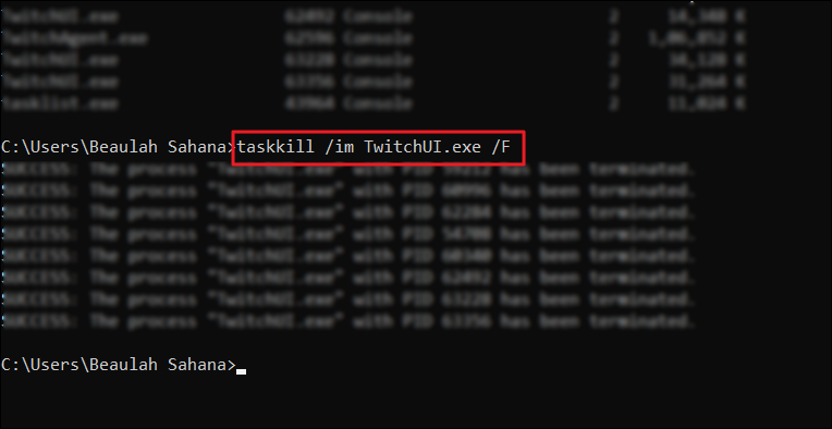 You’ll see a ‘SUCCESS’ command when you hit ‘Enter’, notifying the process is terminated. Twitch is now forcefully ended and exited.