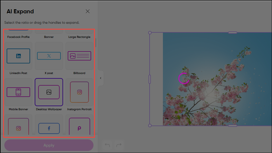 - On the left, you will see the various image expansion presets, such as Instagram Story, YouTube Thumbnail, FaceBook Profile, etc. You can select a preset by clicking on it. When you do so, the generative AI will start expanding it.