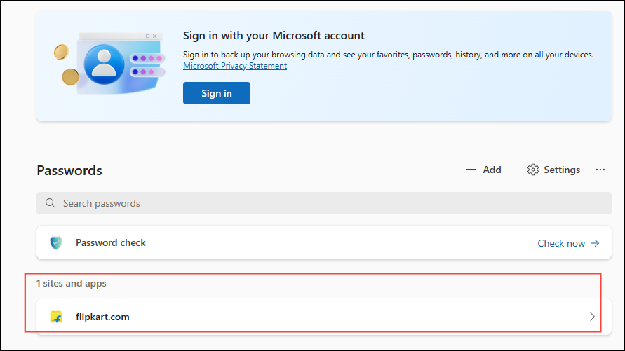 - Clicking the 'Passwords' option will open up the Wallet. Here, you can add, edit, and delete passwords. You will also see passwords previously saved in the browser here.