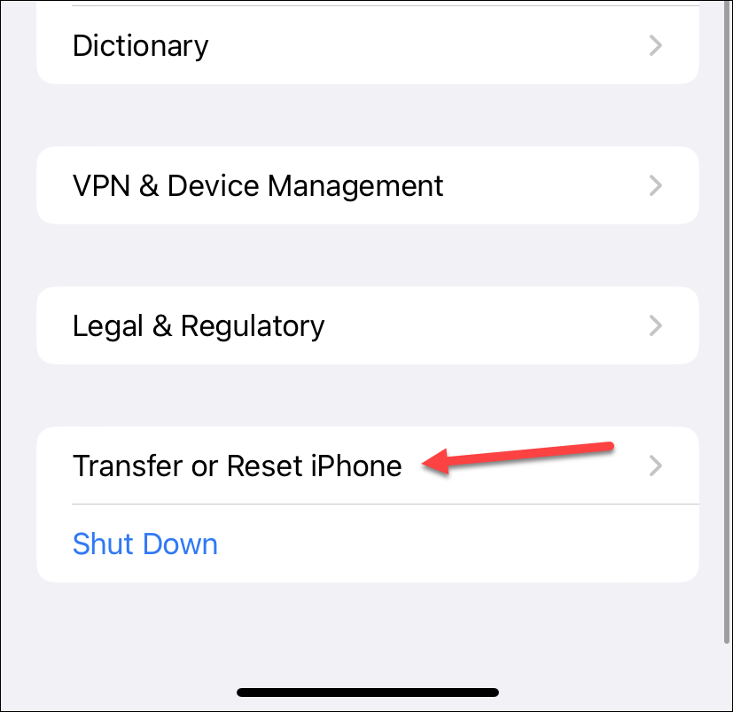 Then, scroll down and tap ‘Transfer or Reset iPhone’.