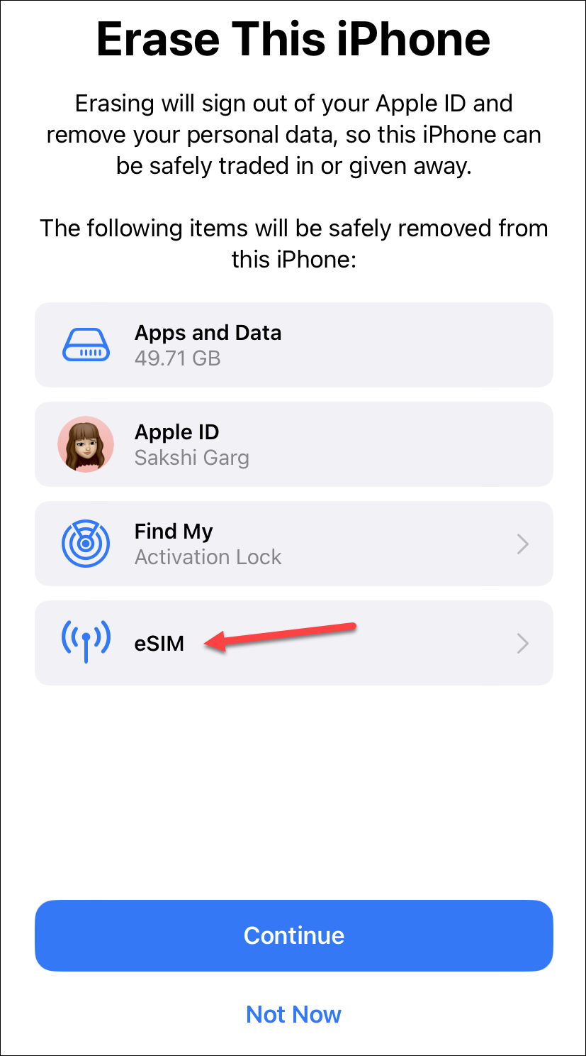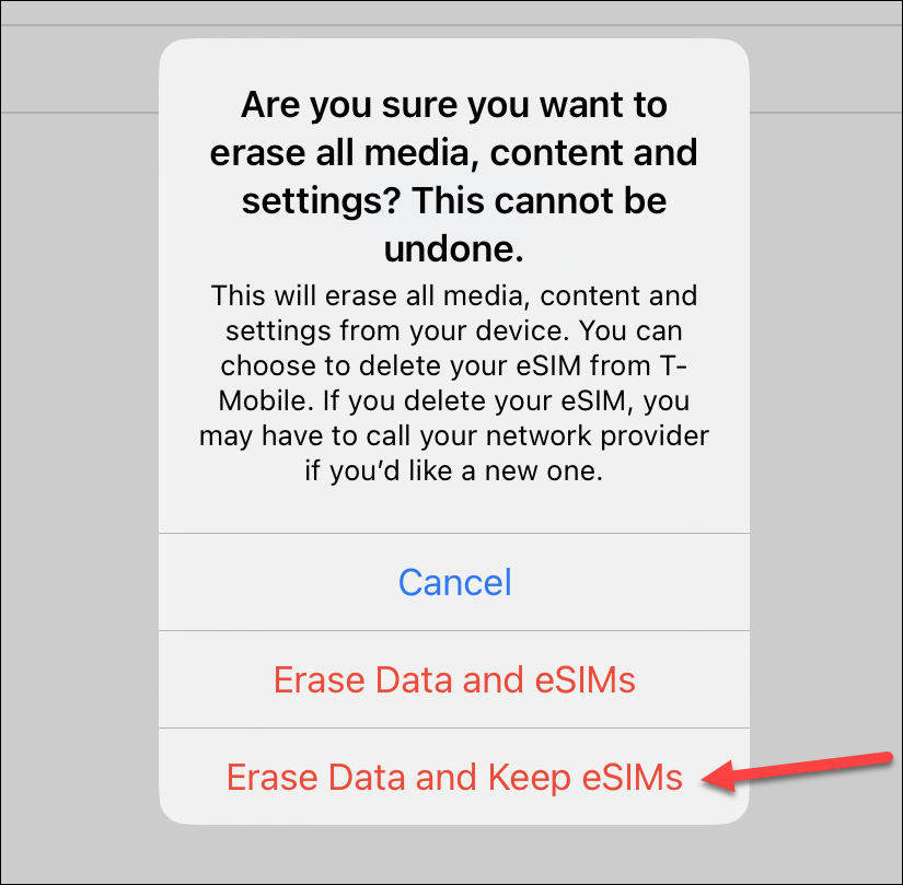 Finally, after all the steps are complete, a confirmation prompt to erase the iPhone will appear. Tap the option ‘Erase Data & Keep Mobile Plan’ or ‘Erase Data & Keep eSIMs’, whichever you see. If you plan to give away your iPhone, remember to tap ‘Erase Data & eSIMs’ instead.