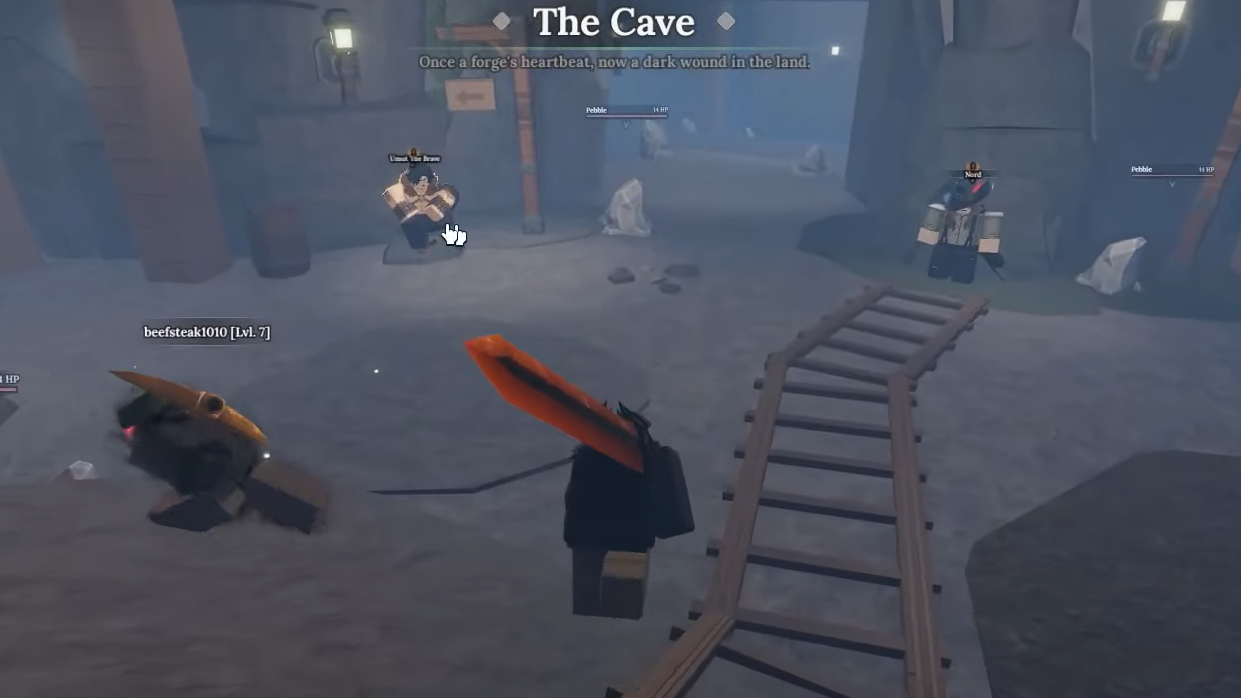 Step 2: Hold down your primary attack button (left mouse on PC, equivalent on console/mobile) so your character is swinging at the rock.