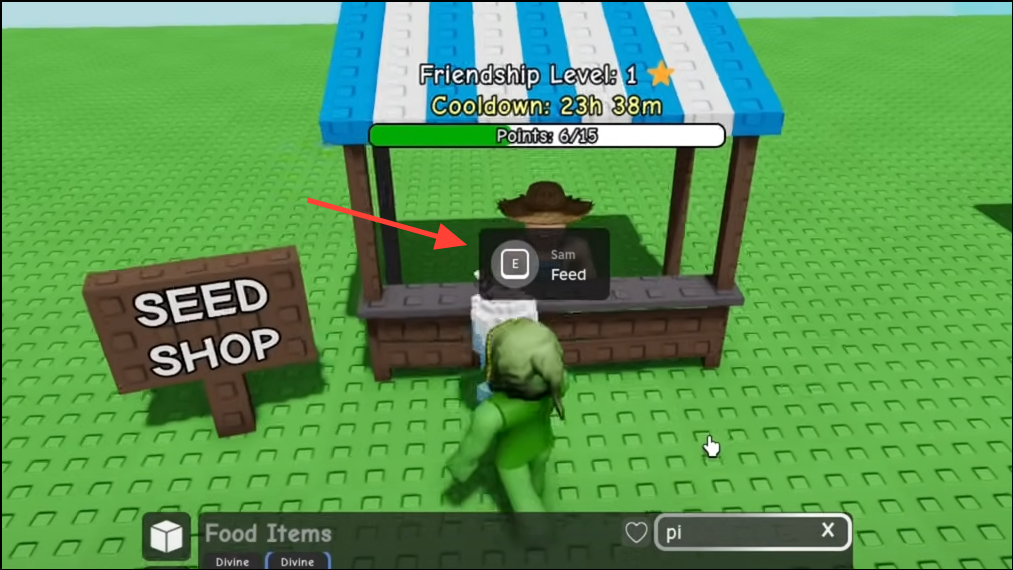 Step 2: Walk up to Sam with the meal in hand. When you are close enough, the interaction changes from the shop to a Feed option.