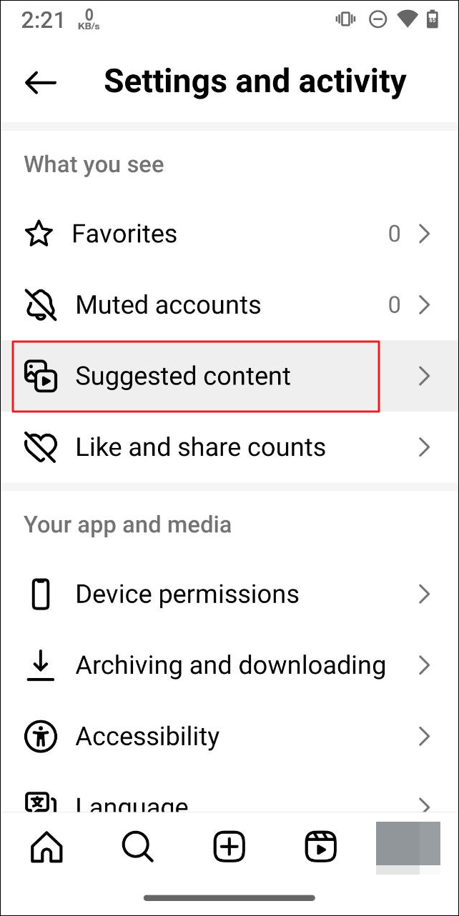 - On the Settings and Activity page, scroll down to the 'What you See' section and tap on the 'Suggested Content' option.