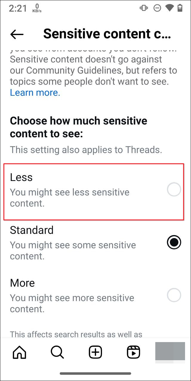- Now you can choose whether to view more or less of sensitive content or go with the standard setting. By default, the 'standard' option will be selected. Tap on the 'Less' option to select it.