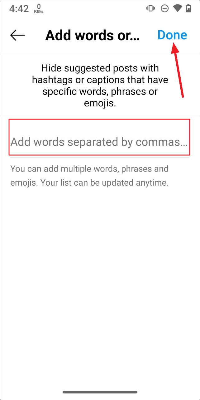 - Type in the phrases, words, and emojis you wish to filter and then on the 'Done' button. Now, any posts and reels containing words and phrases you wish to avoid will not appear in front of you.