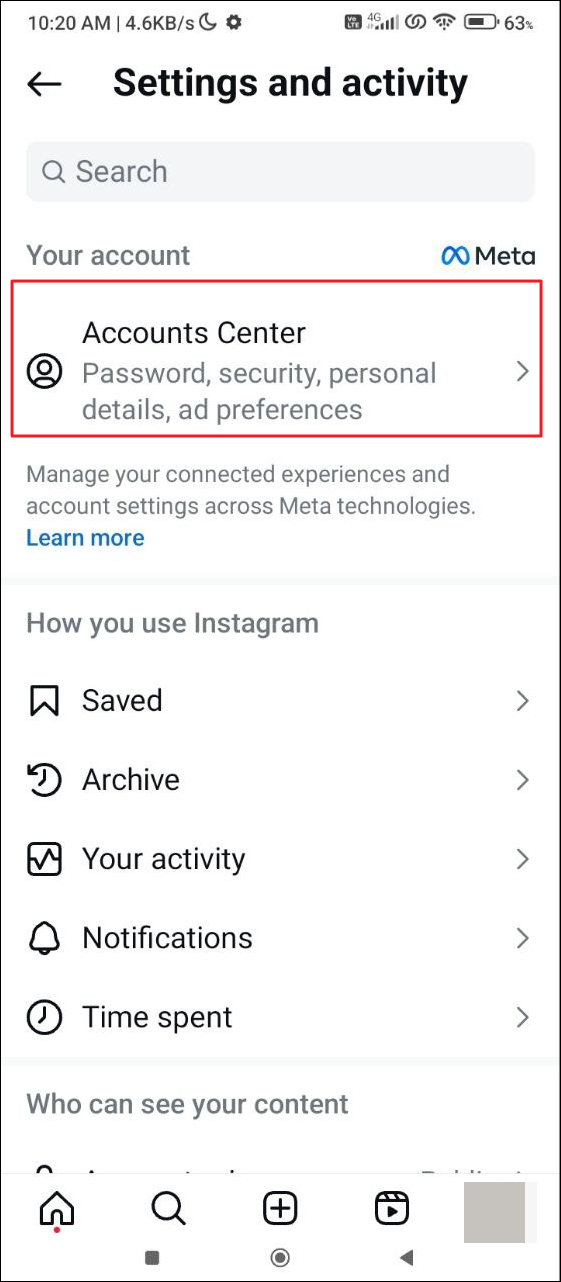 - Go to the Instagram 'Settings and Activity' page in the app and tap on 'Accounts Center'.