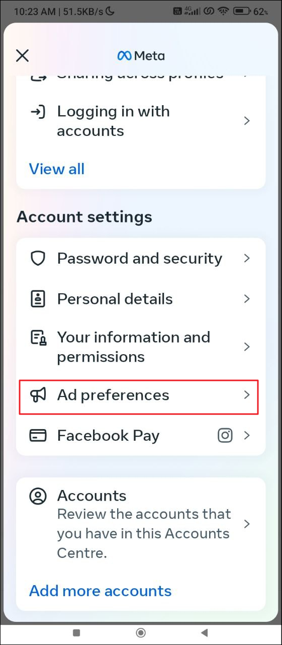 - When the page opens, scroll down and tap on the 'Ad Preferences' option.