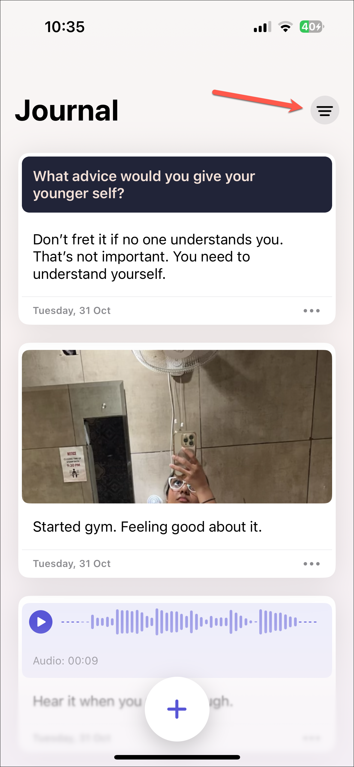 - Open the Journal app on your iPhone. All your entries will appear on the screen in reverse chronological order. Tap the 'Filter' icon (three stacked lines) in the top-right corner of the screen.