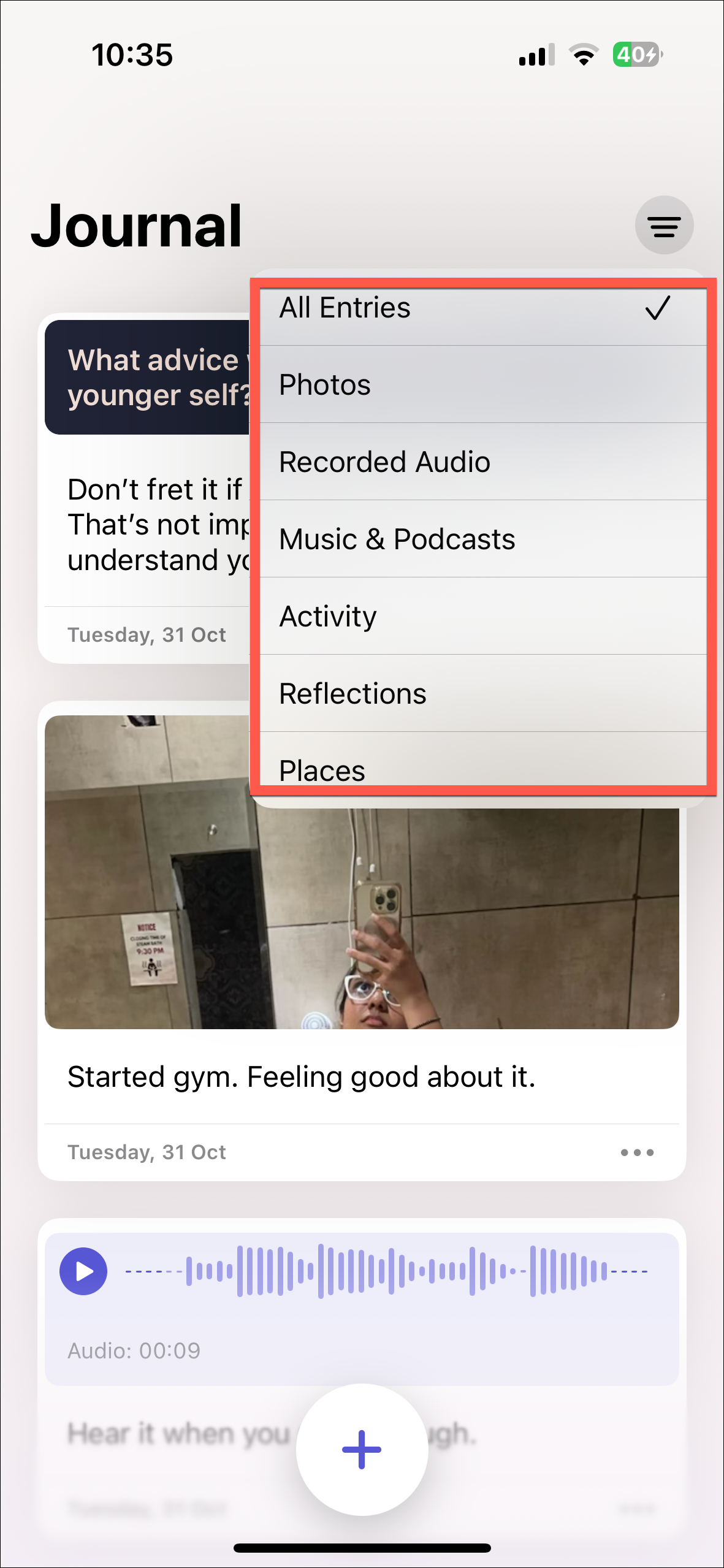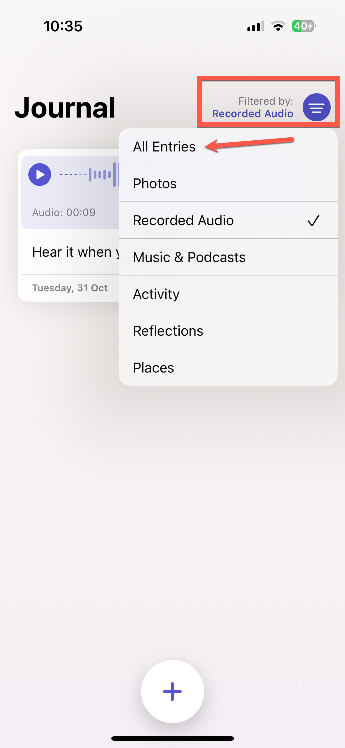 - A menu will open. Depending on the types of entries you have, the options in the menu will vary for you. But they can range from 'All Entries', 'Photos', 'Recorded Audio', 'Music & Podcasts', 'Activity', 'Reflections', and 'Activity'. Unfortunately, there's no option for filtering text-only entries. Tap the option by which you want to filter your entries.