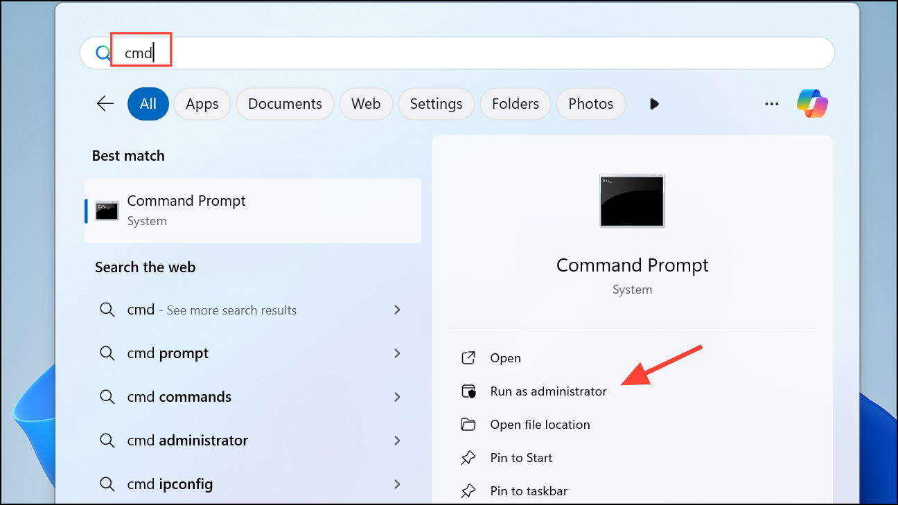 Step 2: Open Command Prompt as an administrator by typing "Command Prompt" into the search bar, right-clicking the result, and choosing Run as administrator.