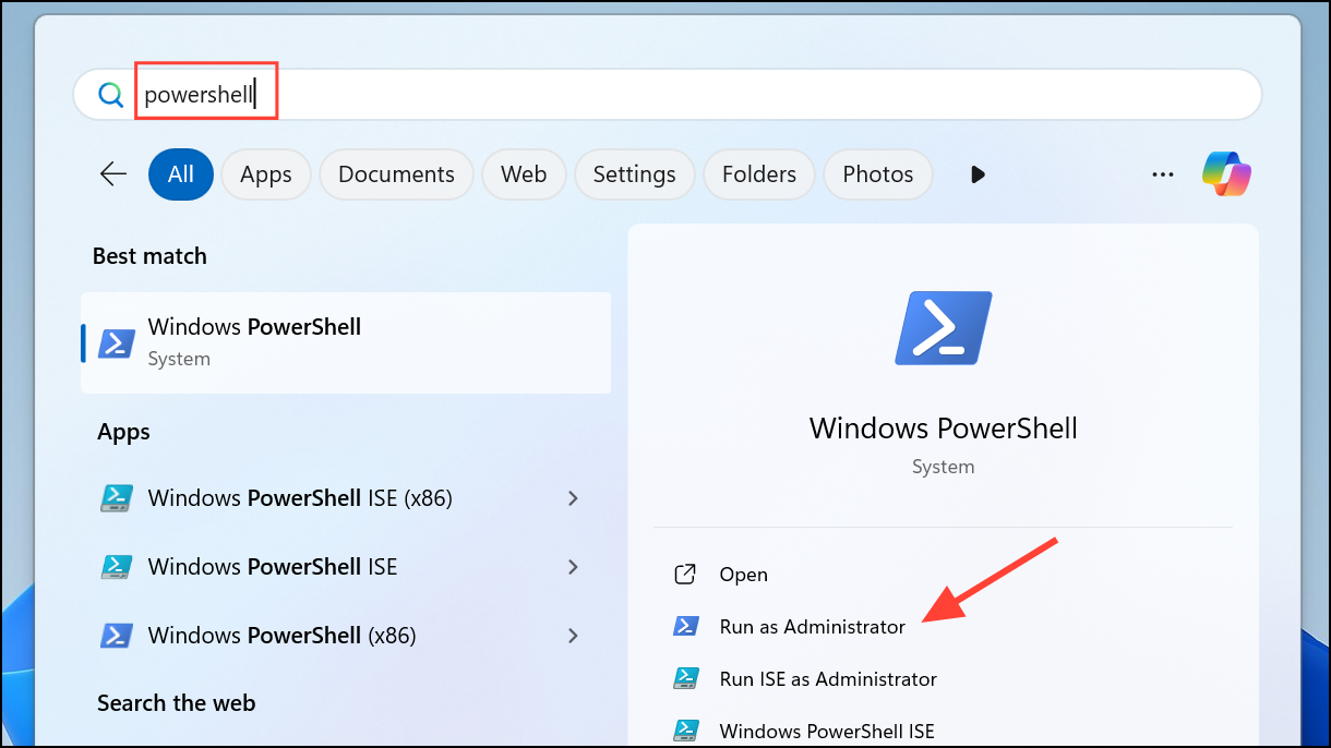 Step 1: Launch PowerShell as an administrator by typing "PowerShell" in the search bar, then selecting Run as Administrator.