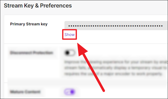 Look to the right of the screen to find the ‘Stream key & Preferences’ section. You’ll find your stream key in dots or code (to protect the stream key) next to the ‘Primary Stream key’ option. Click the ‘Show’ button below the key to see your stream key.
