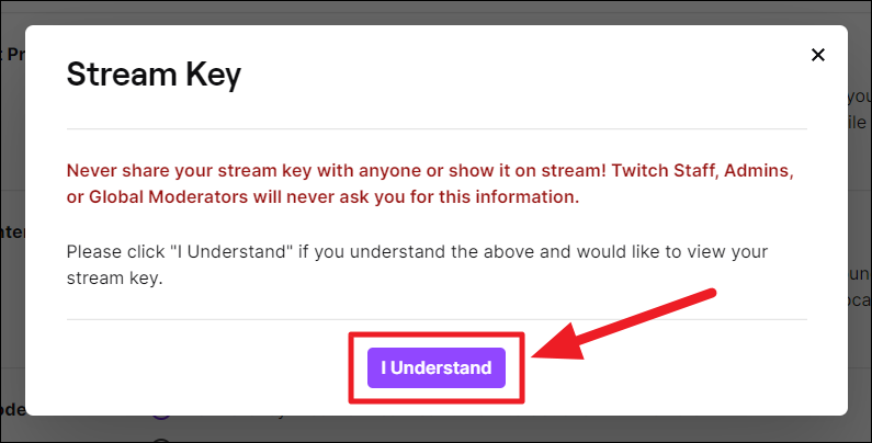 The stream key is super confidential and you will receive a prompt saying just that. Hit the ‘I Understand’ button to proceed to see your stream key.