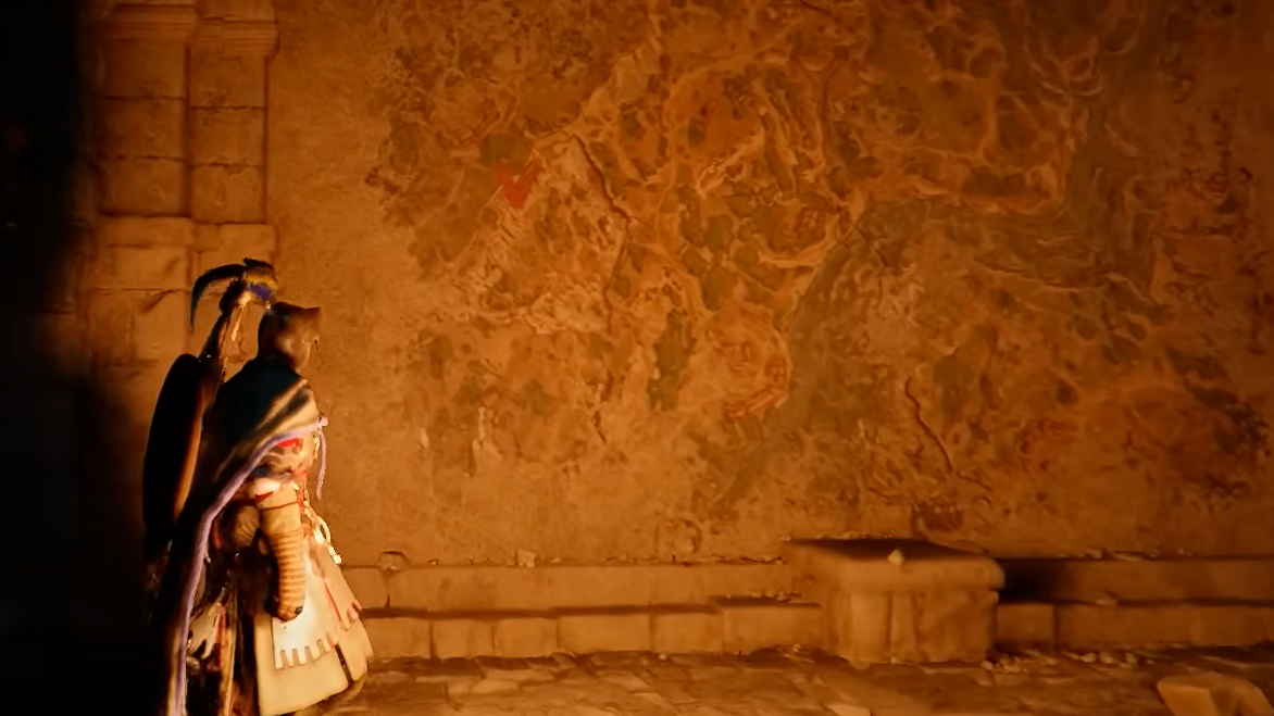 Step 3: Stand in front of the central painted mural — the one depicting a tree — and push it. Hold the input for several seconds. The wall slowly slides open, revealing the puzzle chamber inside.